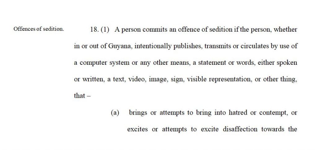 Clause 18 (1) of the Bill makes it an act of sedition for someone to use a computer system to circulate messages deemed to excite or attempt to excite disaffection towards the Government. The clause, according to Public Security Minister, Khemraj Ramjattan covers facebook posts –something which did not sit well with many persons who argued that the Bill will affect freedom of expression.