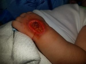 A newborn baby is left with a hole on his left hand as a result of third-degree burns from a...