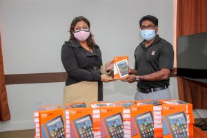 Paul Subryan, General Manager of KFC Guyana handed over 250 Amazon tablets to the Ministry of Education. He said that...