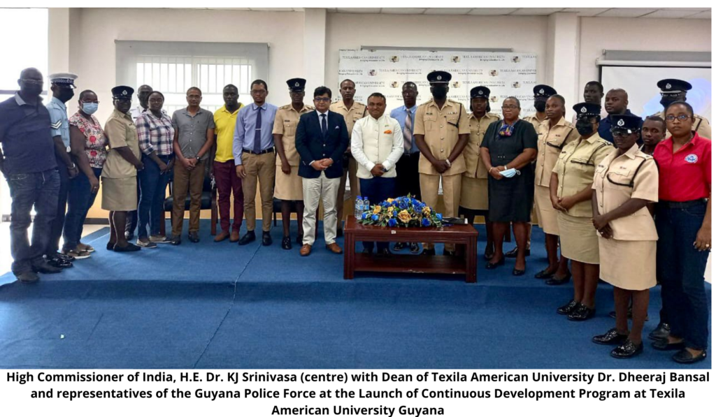 The role of education in improving the country’s growth profile and future progress was highlighted by the High Commissioner. Other speakers included President of Texila American University Mr. Saju Bhaskar (in absentia) Dean Dr. Dheeraj Bansal and representatives of GDF and GPF. The Continuous Development Programme is geared to offer to GPF and GDF ranks an opportunity for higher education in many core subjects and acquiring a certificate at the end of this programme allowing them to better serve the country, making decisions and becoming better leaders thus preparing them for the future. Mr. Kishor Kumar briefed the officers to access the learning system developed to deliver the platform.