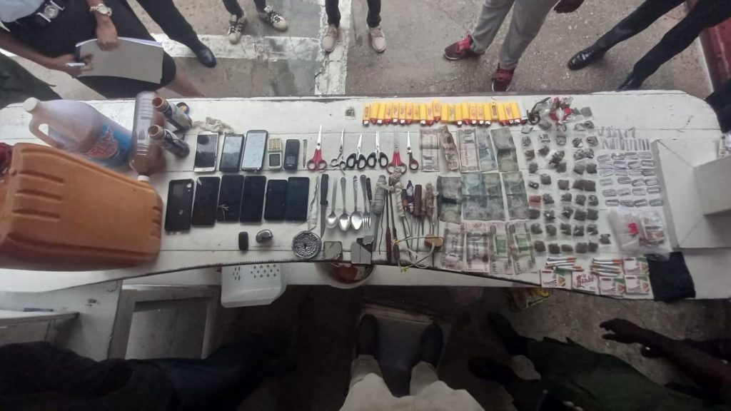 During the search, several contraband items were found including: fermented wine, 10 cellphones, one Digicel Sim card, six scissors, 23 lighters, razor blades, one improvised grater, 15 improvised weapons, three metal spoons, one fork, one knife, $4,660 in cash (Guyana currency), 47 Ziplock bags containing a quantity of marijuana leaves, seeds and stem weighing 87 grams, 30 Pall Mall cigarettes, 18 Bic blades, five packs bamboo, a small quantity of narcotics gums, two mirrors and one air pod case.