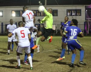 Adrian Arron of the Guyana Police Force Football Club and Santos Football Club’s Stefan Reynolds and Darren Niles claimed the...