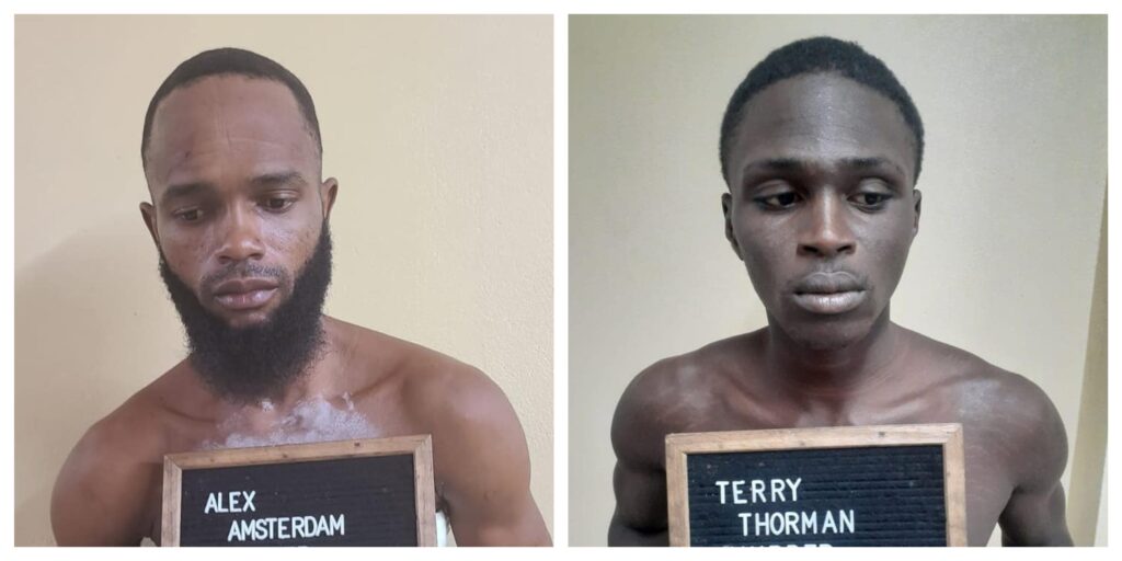 Alex Amsterdam, a 29-year-old security guard from De Kinderen, and Terry Thorman, a 23-year-old mini bus conductor from LMeten-Meer-Zorg, West Coast Demerara have been remanded to prison following their court appearance on Friday on two counts of murder.