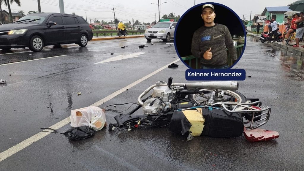 The blue lorry, owned by Nand Persaud Company Limited of No. 38 Village, Corentyne, Berbice, and driven by 21-year-old Saheed Ramcharran of Good Hope, East Coast Demerara, collided with the motorcycle.